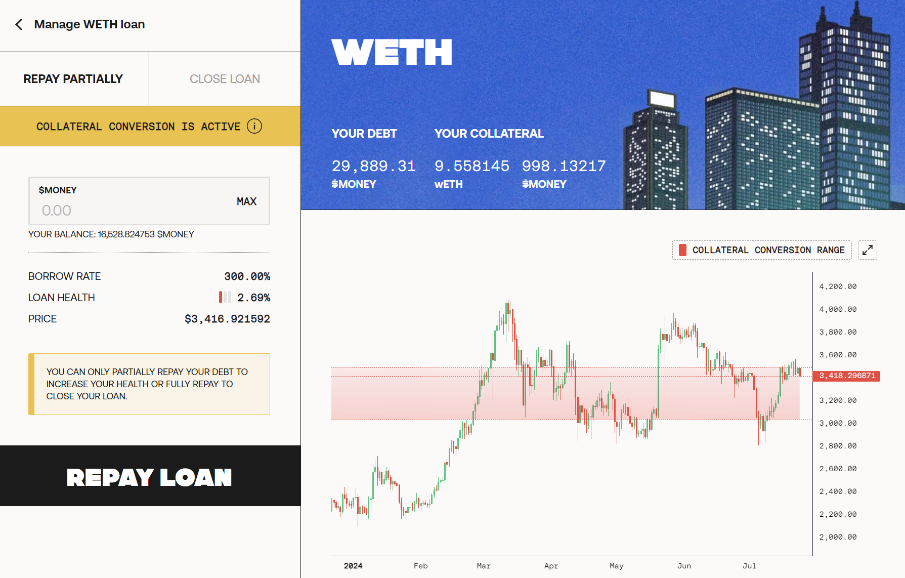 Partially repaying the loan whilst in collateral conversion mode will not take you out of the collateral conversion mode, as the price bands are "locked in" in during the conversion mode to ensure the best rates for the user. Repaying will improve the loan health though as the liquidation price moves further down, and you lower your interest fees. You can also fully repay the loan without closing the loan, in the hopes of the price of your collateral going back up so the $MONEY portion of your collateral gets converted back into the original collateral by the protocol automatically.
