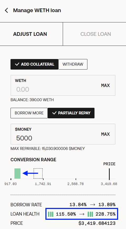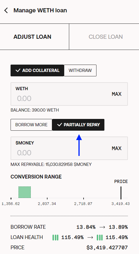 `Partially repay:` this action is for paying back some amount of the loan with $MONEY. You can also withdraw some of the collateral in the same transaction.