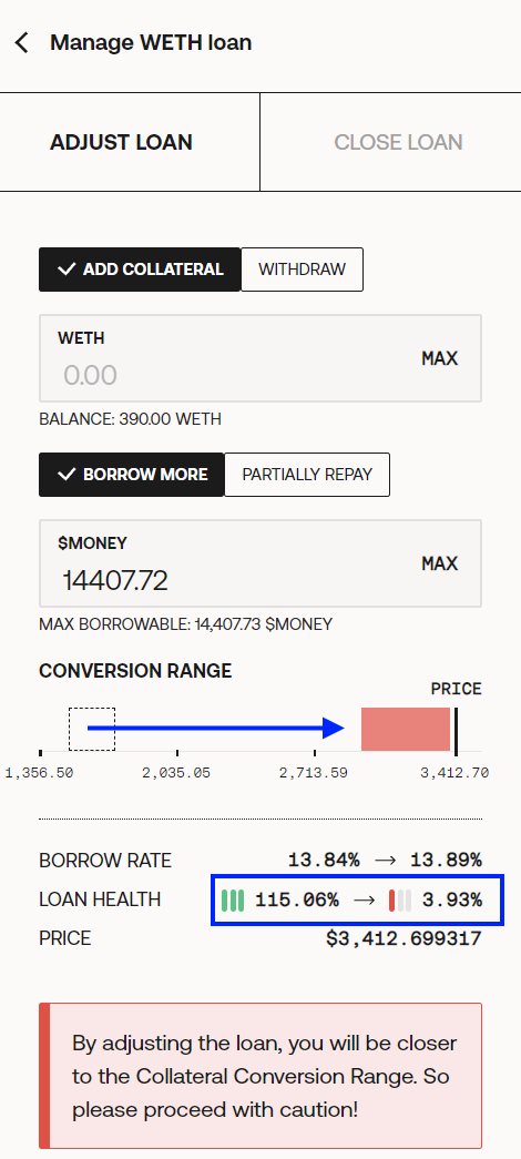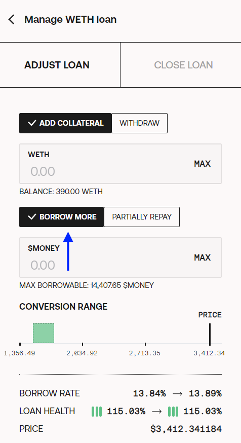 `Borrow more:` this action is for borrowing more $MONEY through the same loan. Doing this action by itself will decrease the loan health, so pay attention to the risks. You can also add collateral and borrow more $MONEY in the same transaction.&#x20;