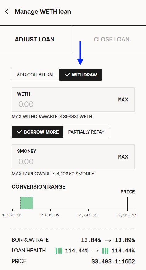 `Withdraw:` this action is for withdrawing collateral from the loan, which will decrease the loan health if you still are actively borrowing $MONEY. You can also withdraw collateral and partially repay the loan with $MONEY in the same transaction.