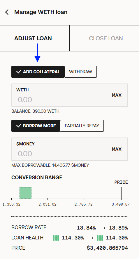 `Add collateral:` this action is for adding more collateral to the loan, either to increase the loan health, or to add more collateral so you can mint more $MONEY. You can also add collateral and borrow more $MONEY in the same transaction.
