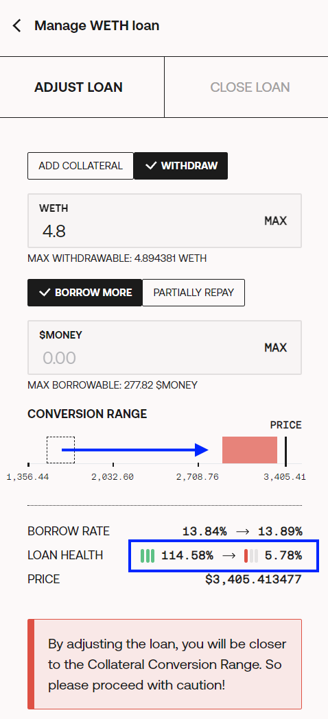 Note that you can combine these actions in the same transaction, so you could for example add collateral and borrow more $MONEY in the same transaction as they will be bundled automatically when you click `ADJUST LOAN`!